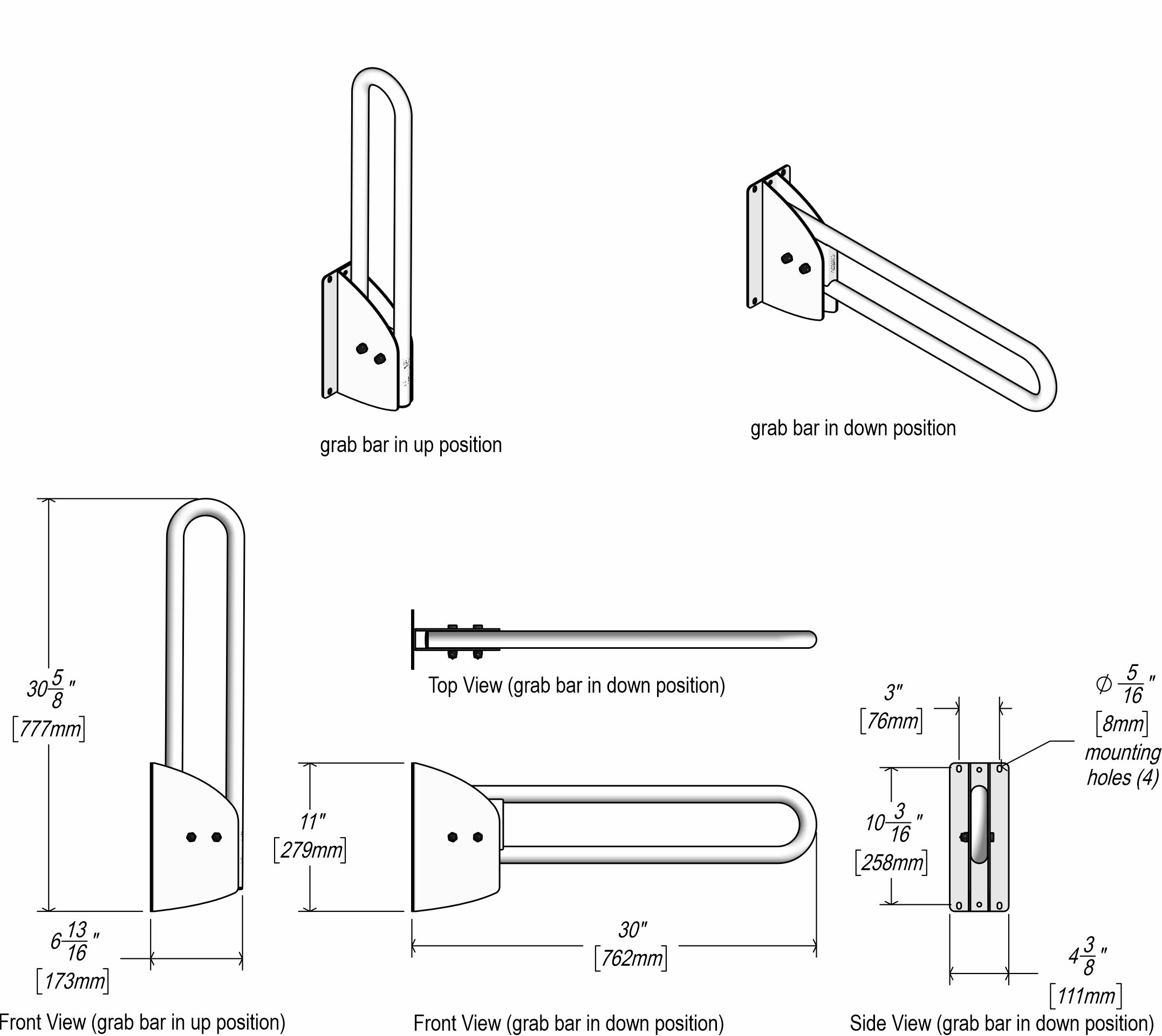 Nous recommandons l'installation par des personnes de métier qualifiées. Les installateurs doivent consulter et se conformer aux codes du bâtiment locaux. Le matériel de montage et les autres systèmes doivent être déterminés par l'entrepreneur et l'installateur en fonction de la structure, de la conception et des conditions spécifiques. Toutes les installations doivent être entièrement inspectées et approuvées par les propriétaires et le personnel d'entretien avant la mise en service du bar. Le non-respect de la procédure d'installation appropriée annulera la garantie et peut entraîner un dysfonctionnement ou des blessures. Fixez au mur là où un support mural adéquat existe. Utilisez la plaque murale comme gabarit pour localiser les trous de montage. Percez des trous et placez les ancres comme il convient. Montez la barre d'appui et fixez les vis de montage. La barre d'appui rabattable 1055 supportera des charges de 600 lb. et plus grand. Les types de charges (surtout dynamiques) appliquées sont difficiles à prévoir. Il appartient au concepteur de déterminer l'adéquation de l'utilisation de ces barres d'appui dans leur situation spécifique. Attention : La barre d'appui est seulement aussi solide que les ancrages et le mur auxquels elle est fixée et, par conséquent, doit être solidement fixée afin de supporter la ou les charges auxquelles elle est destinée. Nous suggérons l'installation par une personne de métier qualifiée.