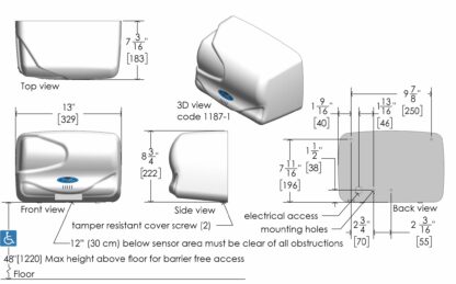 Ensure when mounted that dryer is 12" (30cm) above any fixed or movable objects. For unrestricted access ensure bottom of dryer does not exceed 48" (120 cm) from floor. Four threaded mounting anchors and hole location template provided.