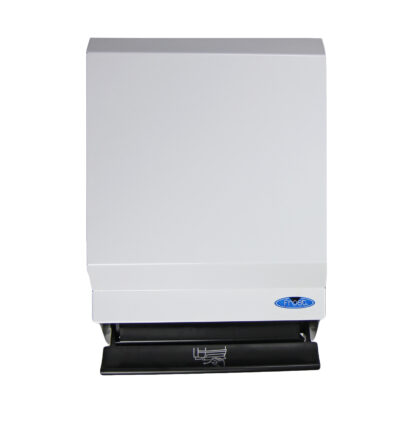 Frost code 109-50W is designed to dispense Jumbo 8″ diameter (4″ reserve roll) x 8″ wide roll towels, core size of 1 ⅜″ and greater. The units are universal; meaning, the unit is non-proprietary and dispenses paper from standard commercial paper producers. This allows the end user to avoid getting locked into paper supply contracts and should save them money on their janitorial supplies. The unit is manually operated and can be refilled by unlocking the dispenser from the top. The lid will then swing down and new paper can be inserted.