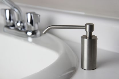 Insert the threaded shank through 7/8″ diameter hole in the vanity with only housing and valve assembly exposed above the counter. Secure with brackets provided below. Fill bottle with soap and attach to the bottom. Please note that it is recommended that all installations be conducted by a qualified tradesperson. Failure to do so may result in serious injury. Please read and follow any additional installation guidelines provided with the products.