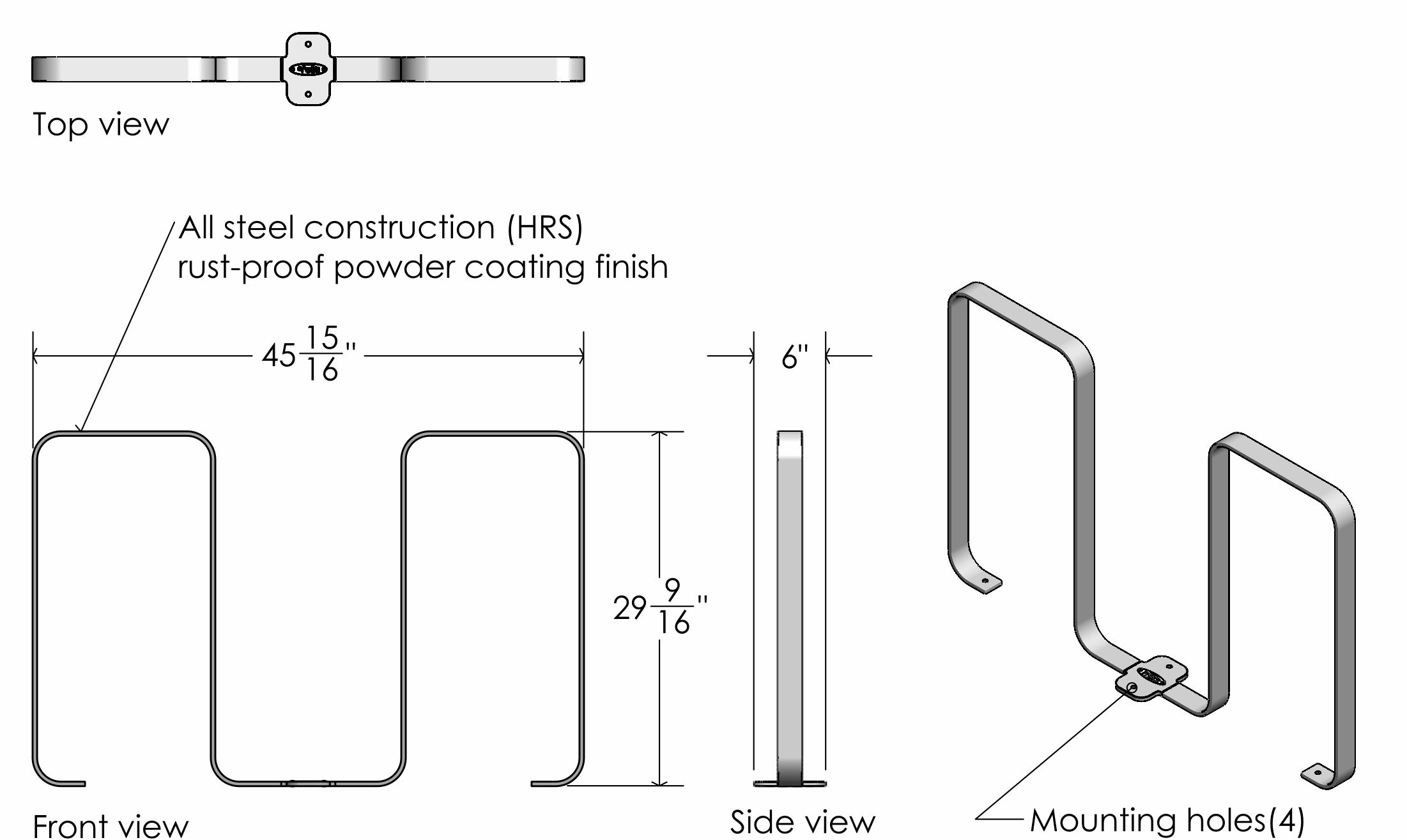 This bike rack can be mounted onto the ground with anchors (not included) or imbedded in concrete. Mounting hole dimensions: 0.4″ for all 4 mounting holes.